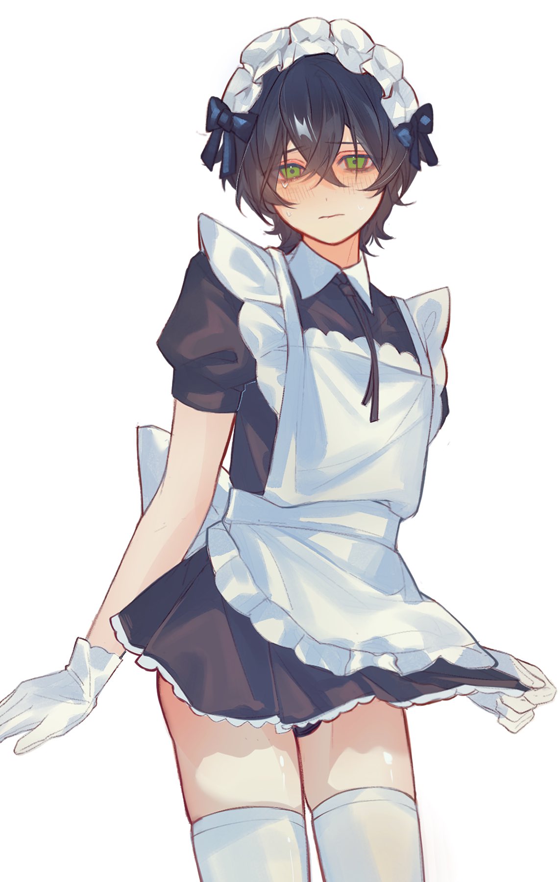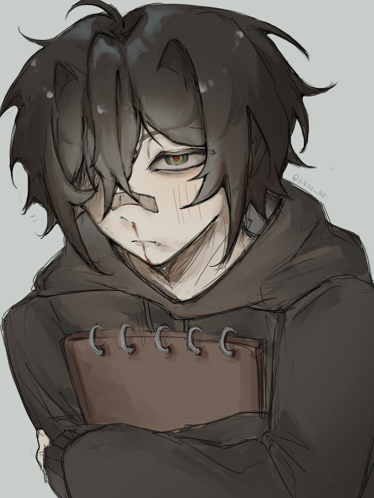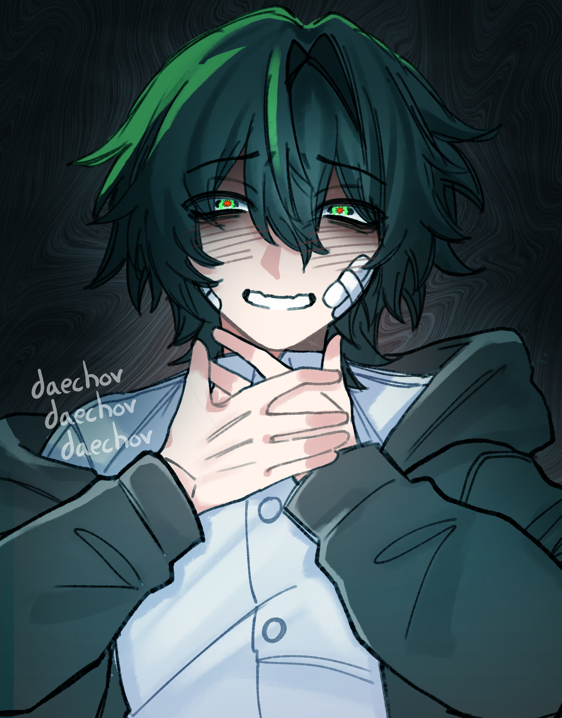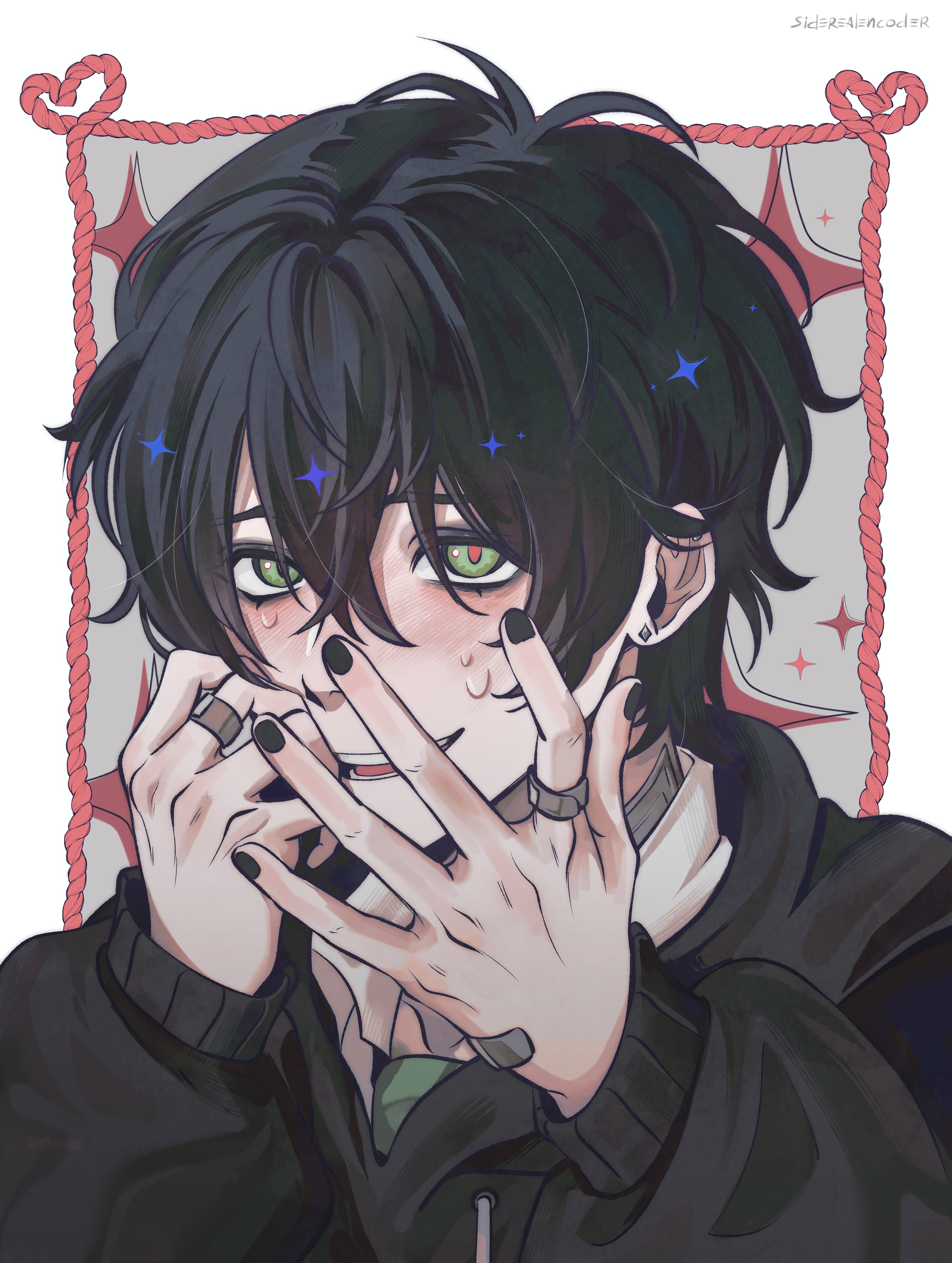 He has a dark fringe, a small stature, and small hands. He is typically depicted with green eyes.